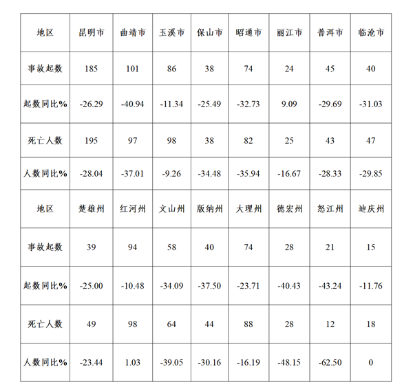 1-11月份,9個(gè)州市發(fā)生較大事故:大理州4起、死亡13人,同比增加2起、6人;曲靖市3起、死亡14人,同比增加1起、7人;楚雄州2起、死亡7人,同比起數(shù)持平、死亡人數(shù)減少1人;紅河州2起、死亡7人,同比增加1起、2人;文山州2起、死亡6人,同比減少3起、11人;玉溪市1起、死亡6人,同比起數(shù)持平、死亡人數(shù)增加1人;昭通市1起、死亡4人,同比減少3起、8人;臨滄市1起、死亡6人,同比起數(shù)持平、死亡人數(shù)增加2人;迪慶州1起、死亡4人,同比增加1起、4人。各州市事故總體情況詳見下表:
