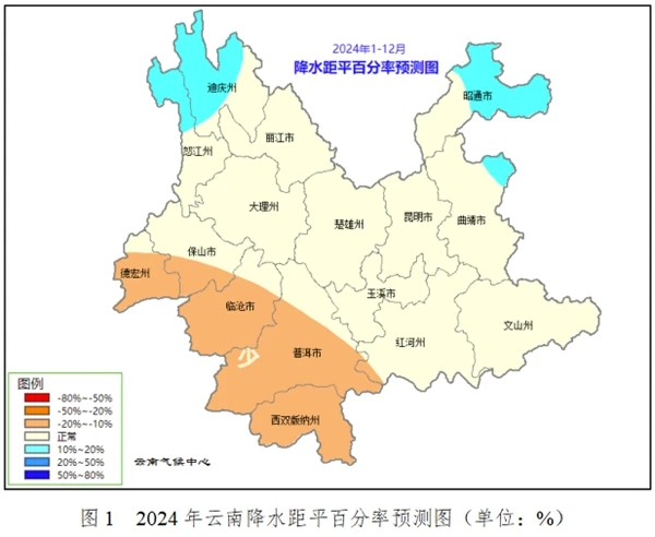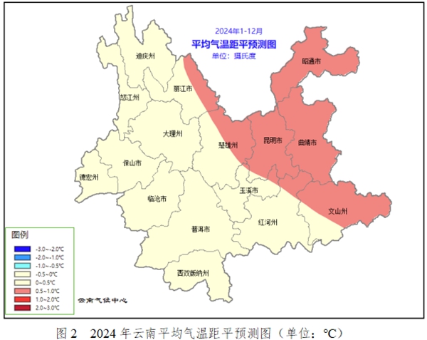 全省大部地區(qū)降水接近常年同期到偏少,氣溫接近常年同期到偏高。據(jù)氣象部門預(yù)測,降水:迪慶州西北部、怒江州北部、昭通市東北部、曲靖市東北部邊緣地區(qū)偏多10%—20%,其余大部地區(qū)接近常年同期到偏少,其中西雙版納州、普洱市中西部、臨滄市中南部、保山市南部、德宏州中南部偏少10%—20%(見圖1)。氣溫:全省大部地區(qū)接近常年同期到偏高,其中文山州中北部、曲靖市、昭通市、昆明市、楚雄州東北部、麗江市東部偏高0.5~1.0℃(見圖2)。重點關(guān)注:冬春季階段性強(qiáng)冷空氣引發(fā)的低溫冰凍雨雪天氣;2月下旬至4月上旬滇東北、滇西北及高海拔地區(qū)倒春寒天氣;春季冰雹大風(fēng)等強(qiáng)對流天氣;春末夏初氣象干旱;主汛期強(qiáng)降水引發(fā)的洪澇和地質(zhì)災(zāi)害,區(qū)域性氣象干旱。