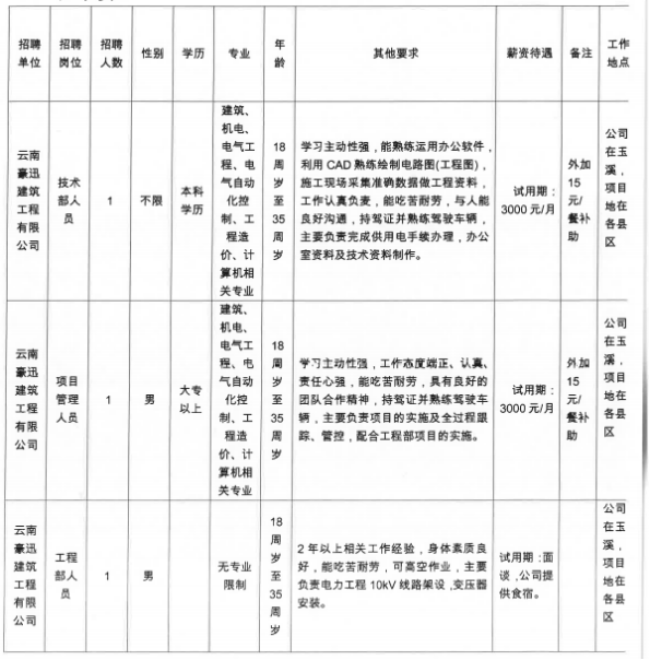 云南豪迅建筑工程有限公司因工作需要,委托澄江市啟澄人力資源有限責(zé)任公司,面向社會(huì)公開招聘技術(shù)工作人員3名,現(xiàn)將有關(guān)事項(xiàng)公告如下: