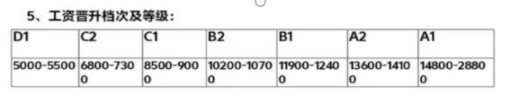 入職前1—6個月執(zhí)行5000-6000元;6—12個月可晉升為6800-7300元;每半年考核晉升一次,月薪資漲幅600-1200;工作滿一年工資8000元左右;工作滿2年,月薪資可達9000-12000,工作滿兩年半,月薪資可達12000-14000。
