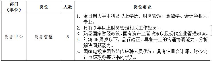 面向國(guó)家電投集團(tuán)系統(tǒng)內(nèi)、外招聘財(cái)務(wù)管理崗位人員8人。