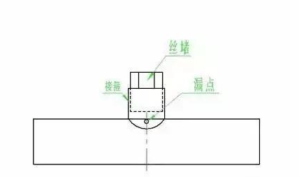 (1)當(dāng)漏點呈一小圓孔時,可用石棉繩一段壓入小孔,然后用尖頭小錘砸緊,再由外向內(nèi)逐步焊住,焊接時電弧不可直接吹向漏點。