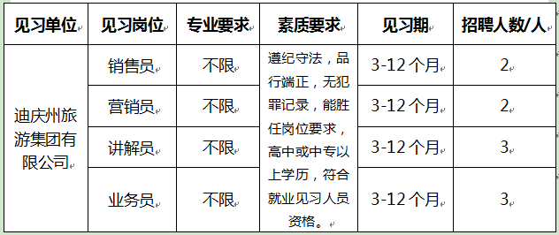 迪慶州旅游集團設(shè)置就業(yè)見習(xí)崗位10個,擬招聘青年就業(yè)見習(xí)人員10人(詳見下表)。