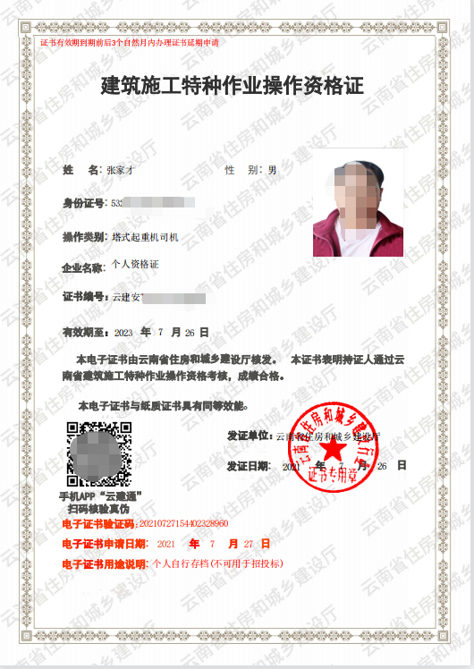 住建廳-塔式起重機(jī)司機(jī)(塔吊證)最新證書樣本